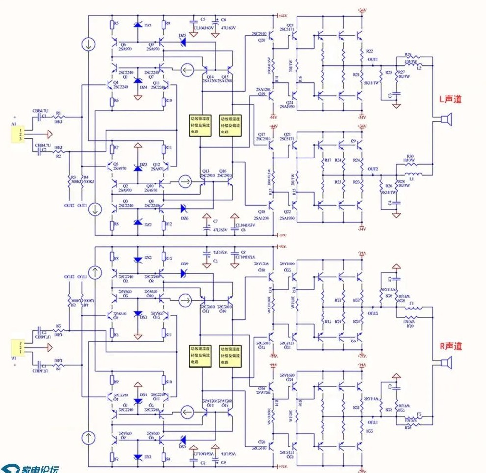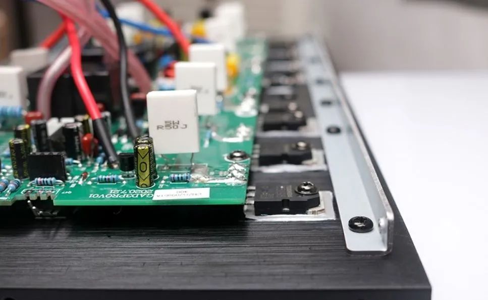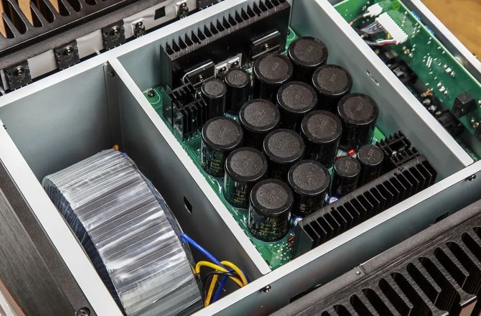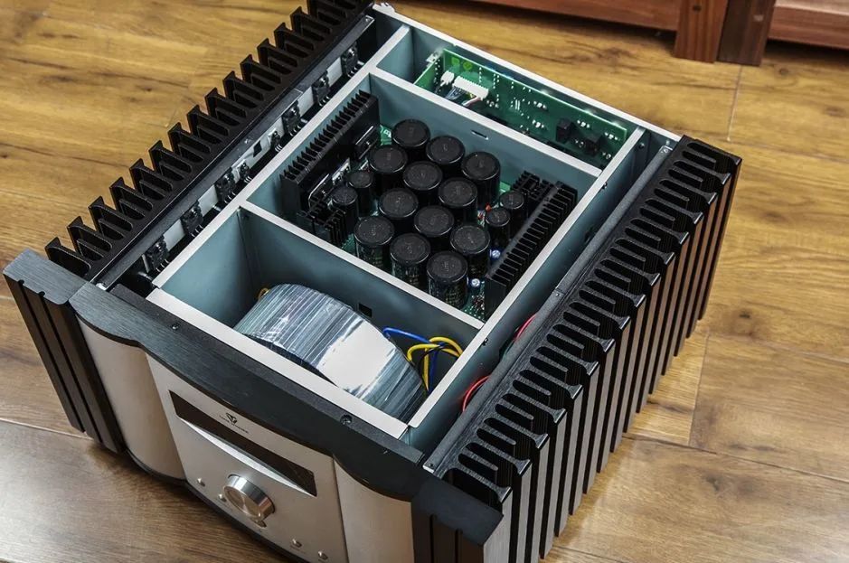 L'apertura del coperchio superiore rivela le schede dei circuiti stampati dell'amplificatore di potenza del canale sinistro e destro, situate in scomparti metallici accanto ai dissipatori di calore. Queste schede contengono resistori, condensatori e transistor, che costituiscono il circuito principale dell'amplificatore. Di seguito, troverete le foto dei circuiti stampati e uno schema elettrico semplificato per maggiore chiarezza.