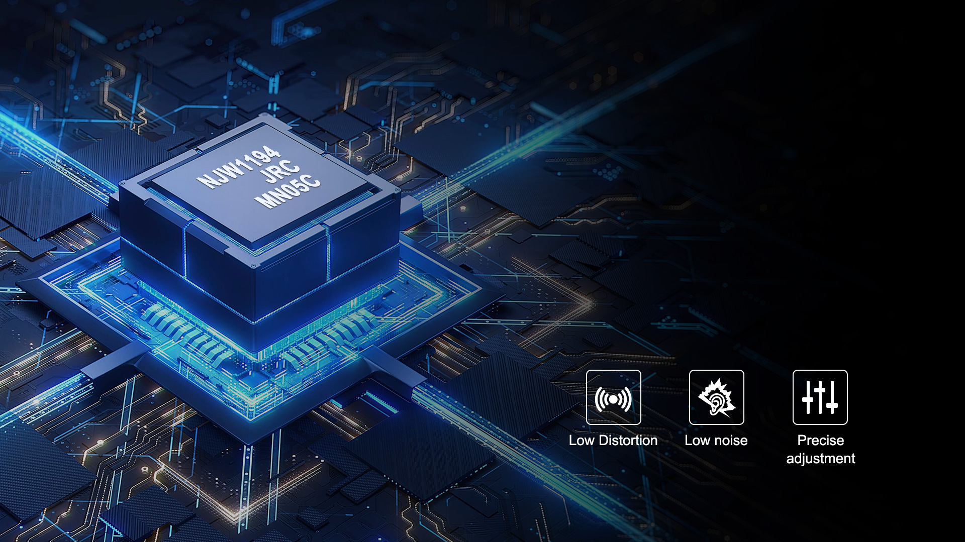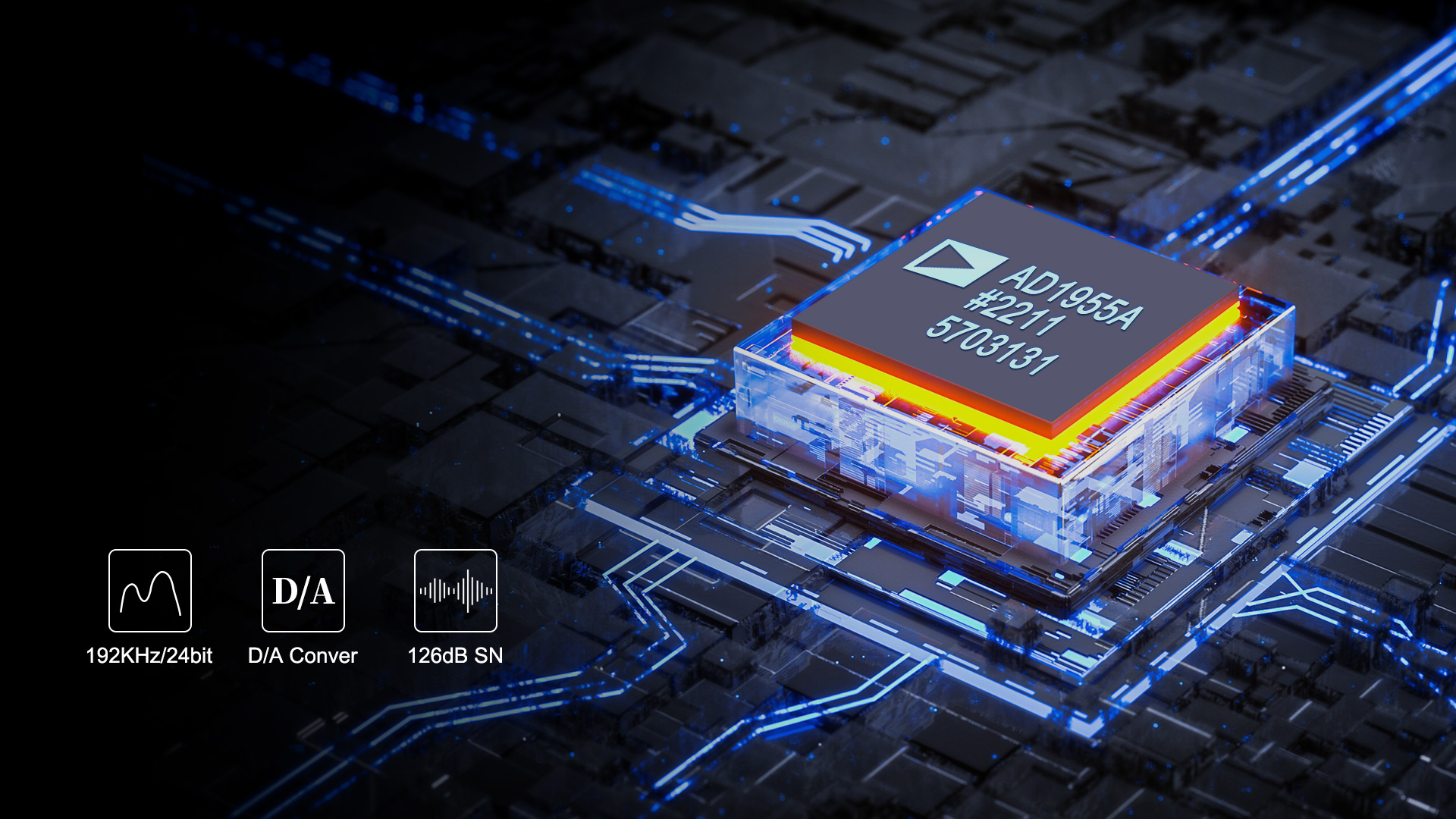 Utilizza il chip DAC AD-1955, acclamato dalla critica, che offre un'eccezionale precisione di campionamento a 192 kHz/24 bit e standard di quantizzazione eccellenti. È dotato di filtraggio digitale indipendente e conversione D/A con una gamma dinamica e un rapporto segnale/rumore eccezionali di 126 dB.