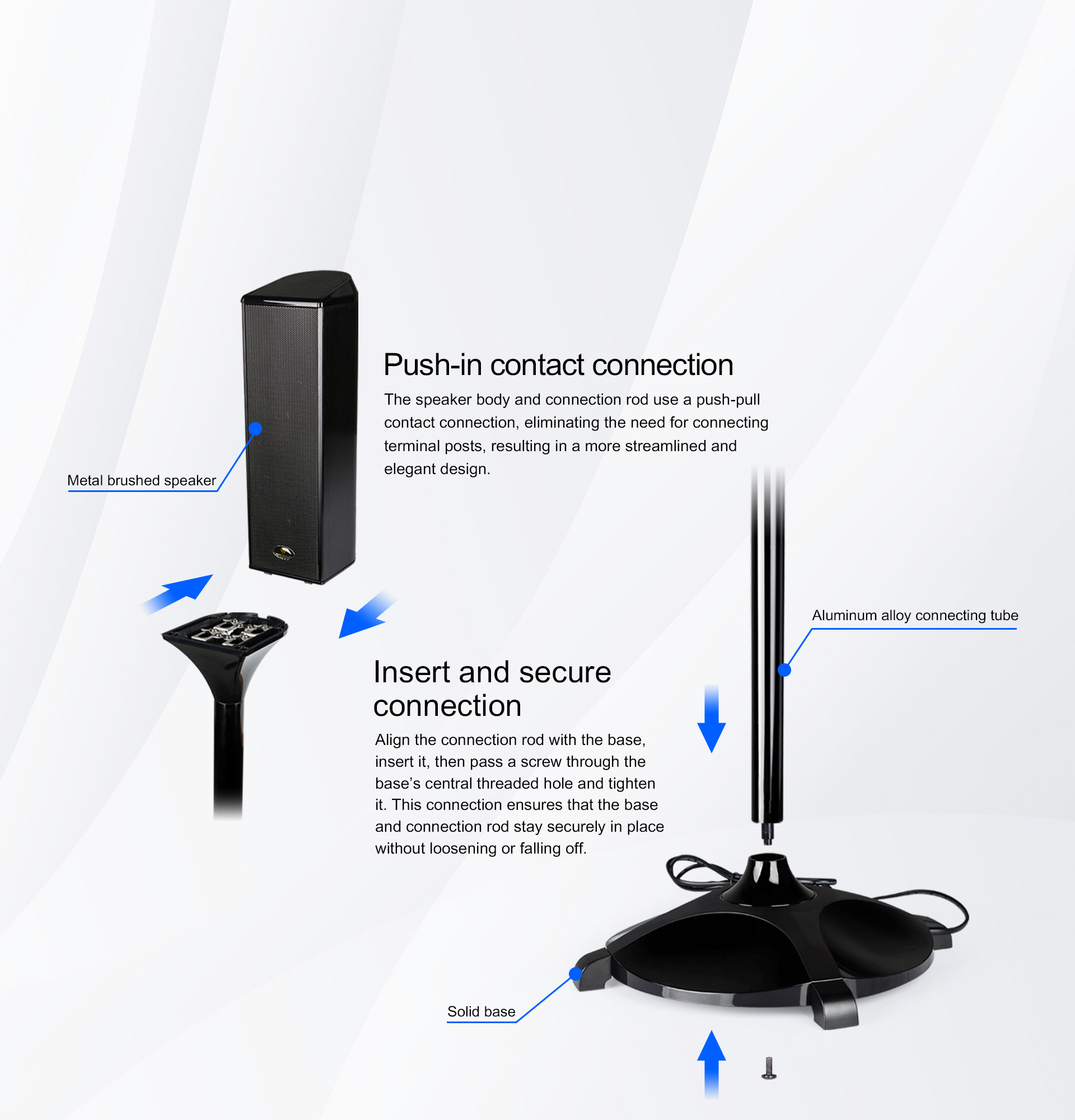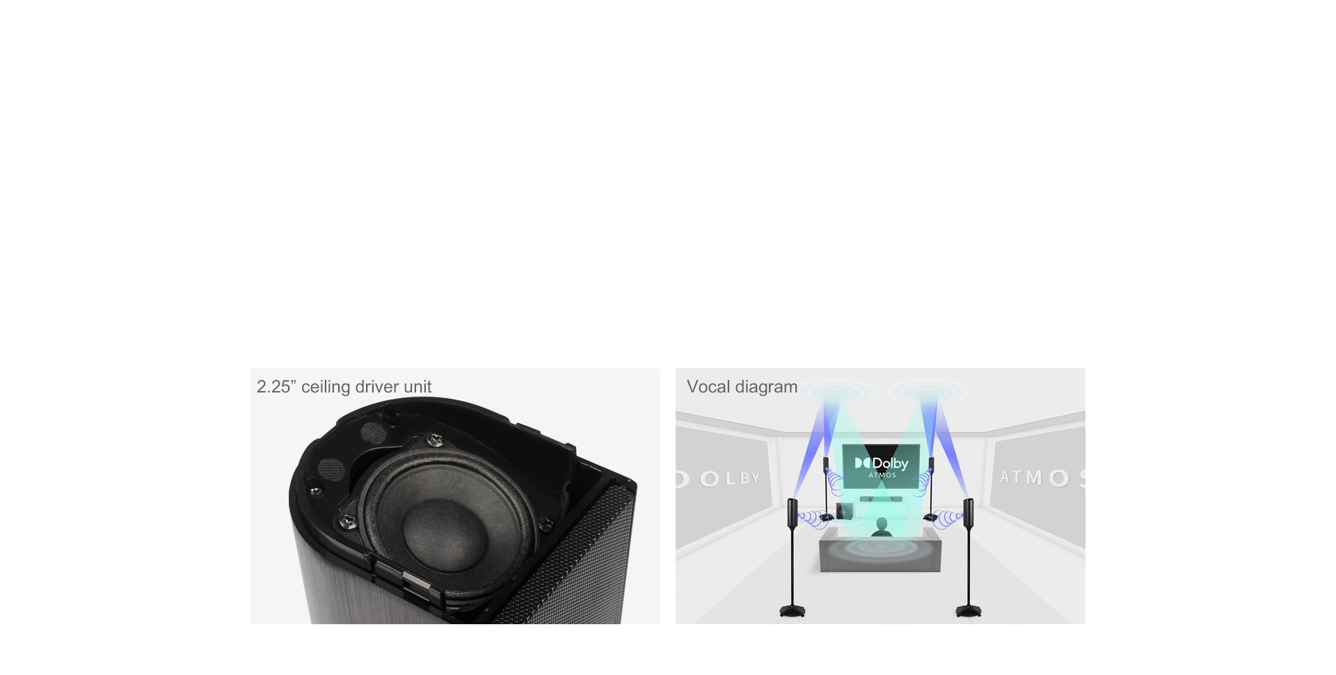Ogni altoparlante è posizionato con un'angolazione precisa per pilotare le unità, in modo da creare un campo sonoro senza punti morti.