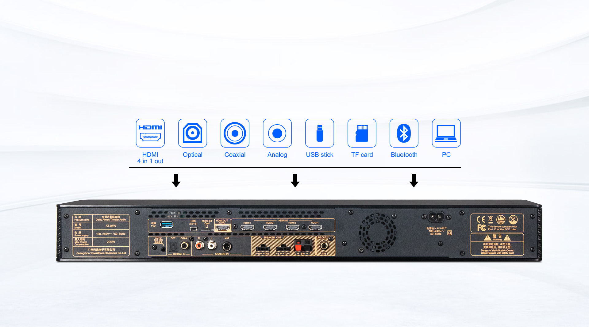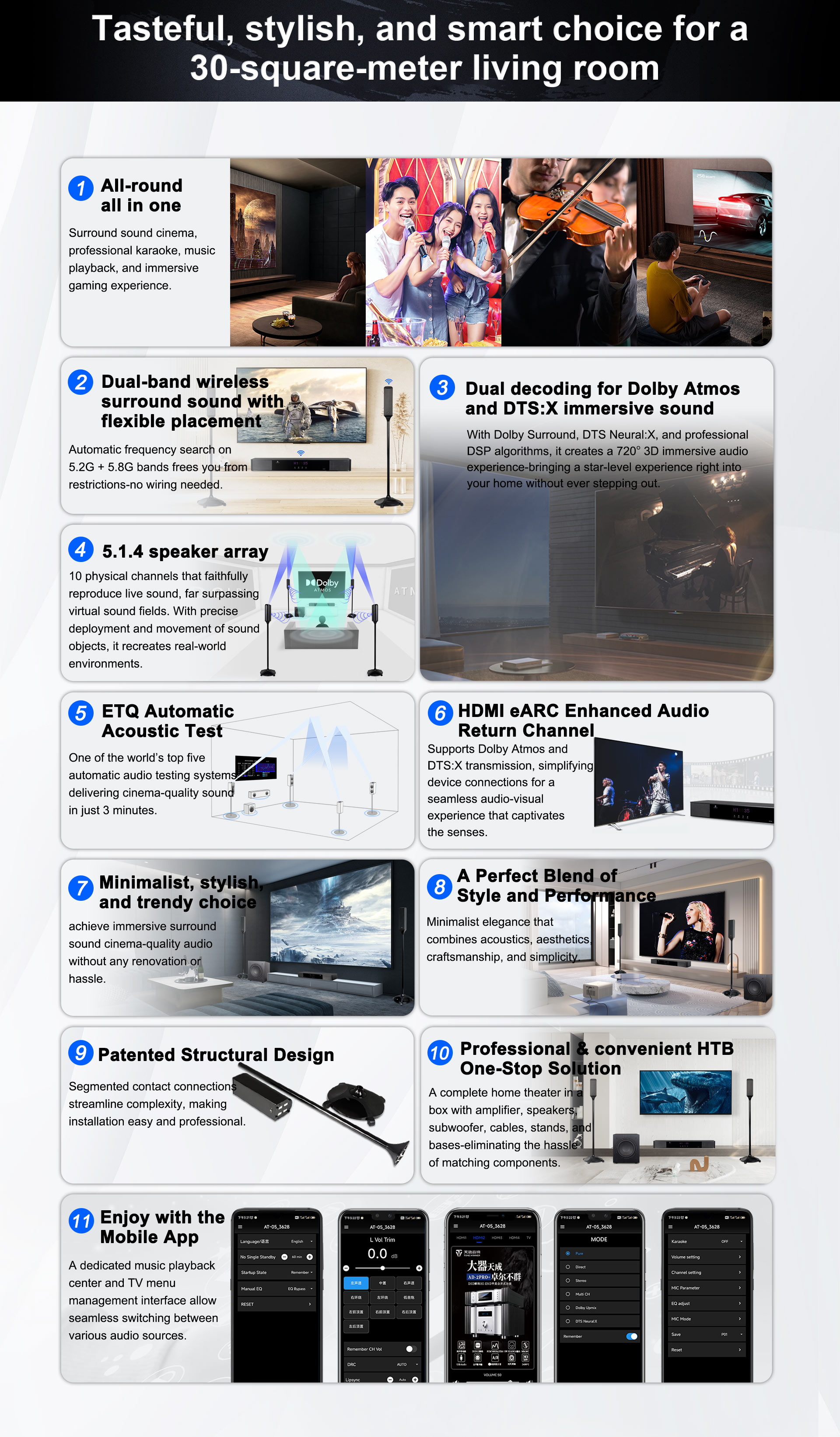 Tonewinner YX-02P è un sistema home theater all-in-one che combina audio surround Dolby Atmos, KTV professionale, musica Hi-Fi ed esperienze di gioco. È dotato di un array di altoparlanti 5.1.4, che supporta i formati audio immersivi Dolby Atmos e DTS:X. Inoltre, supporta video 4K, offrendo un'esperienza immersiva senza pari. Il sistema offre audio surround a 5.1.4 canali di qualità professionale per il karaoke, controllo tramite app per smartphone, compatibilità con schede USB/TF, trasmissione Bluetooth lossless e ritorno audio eARC.