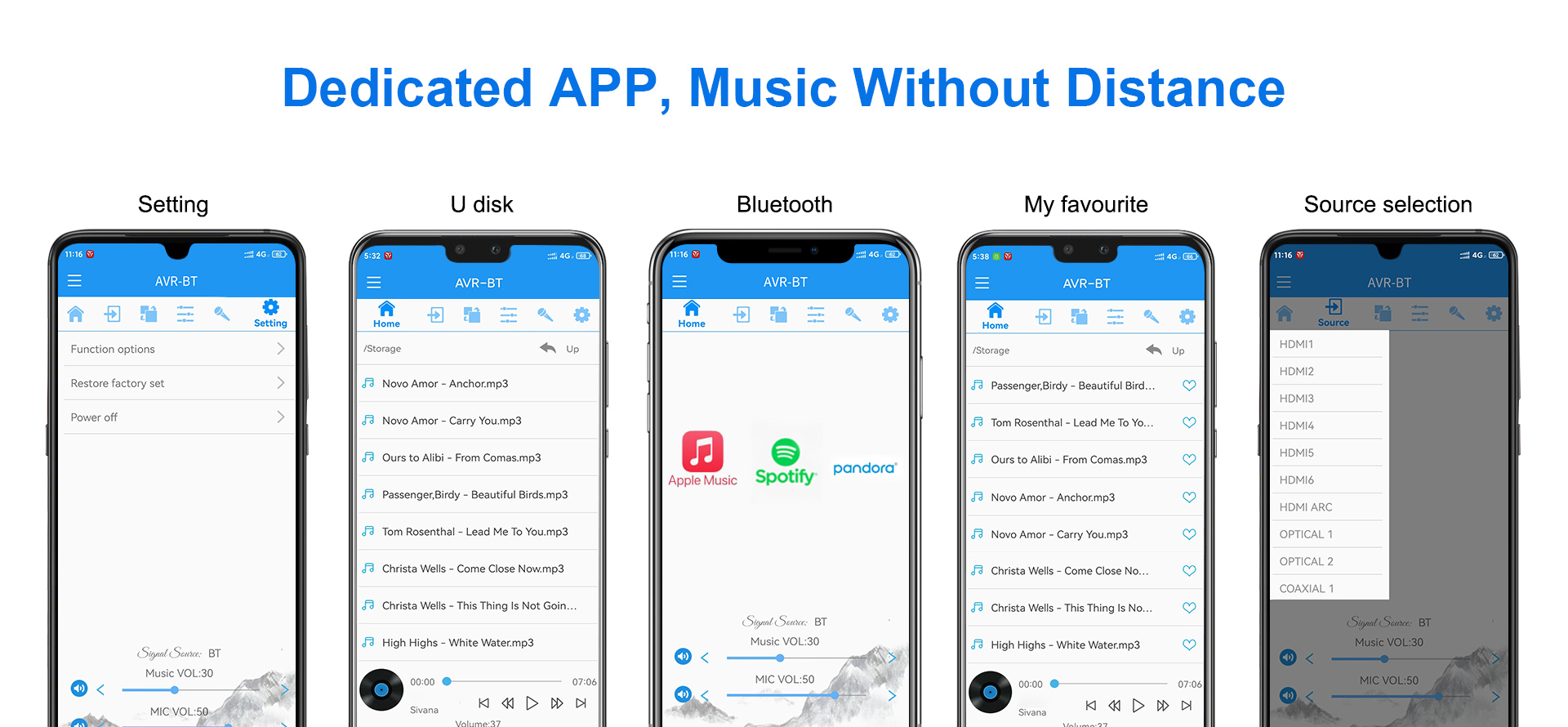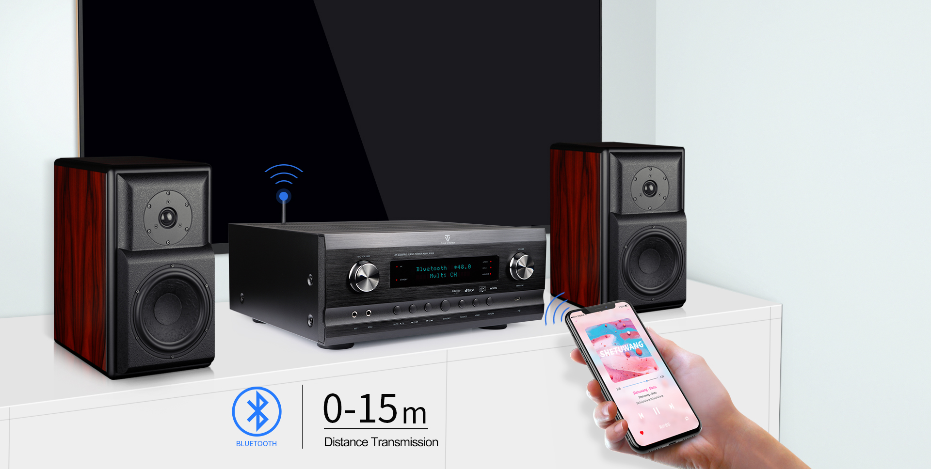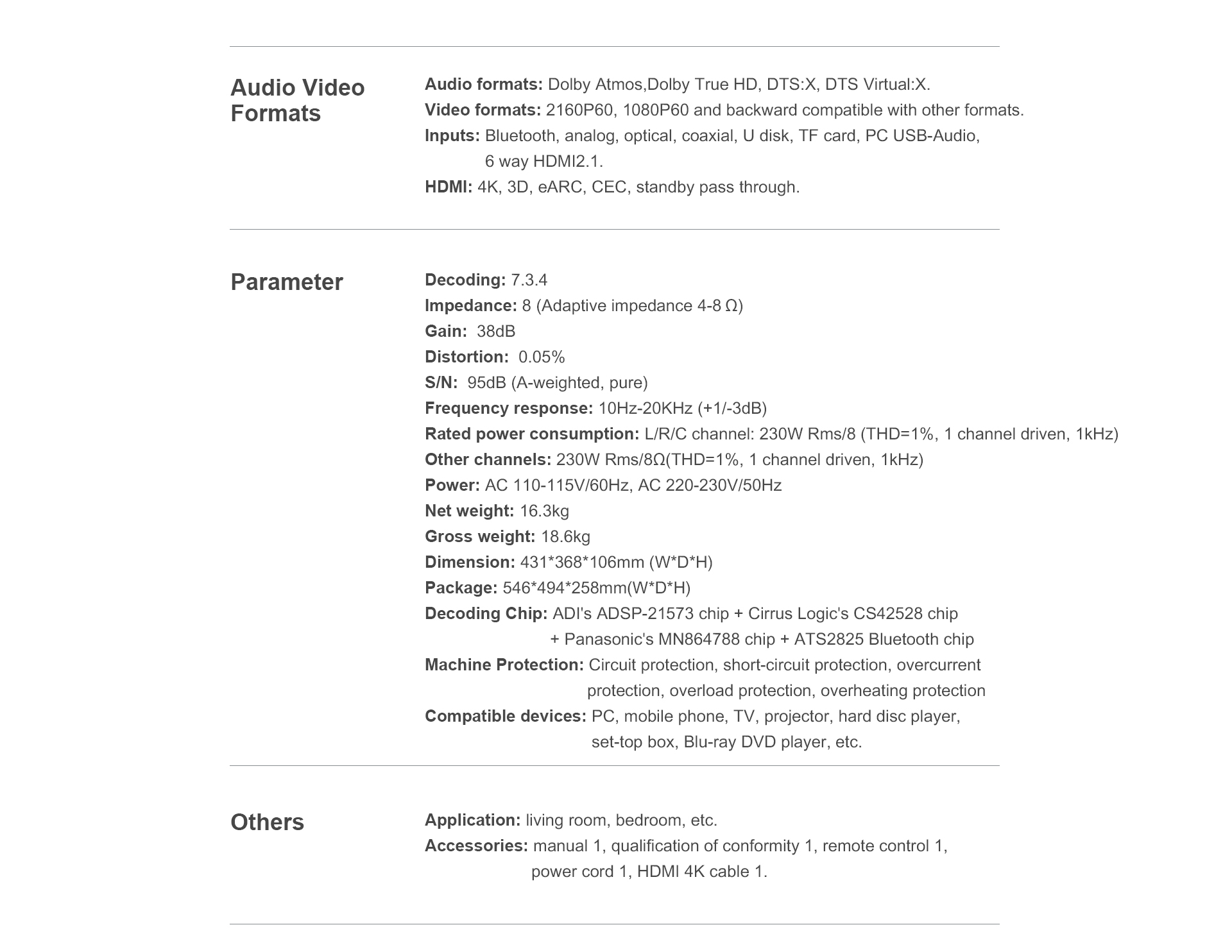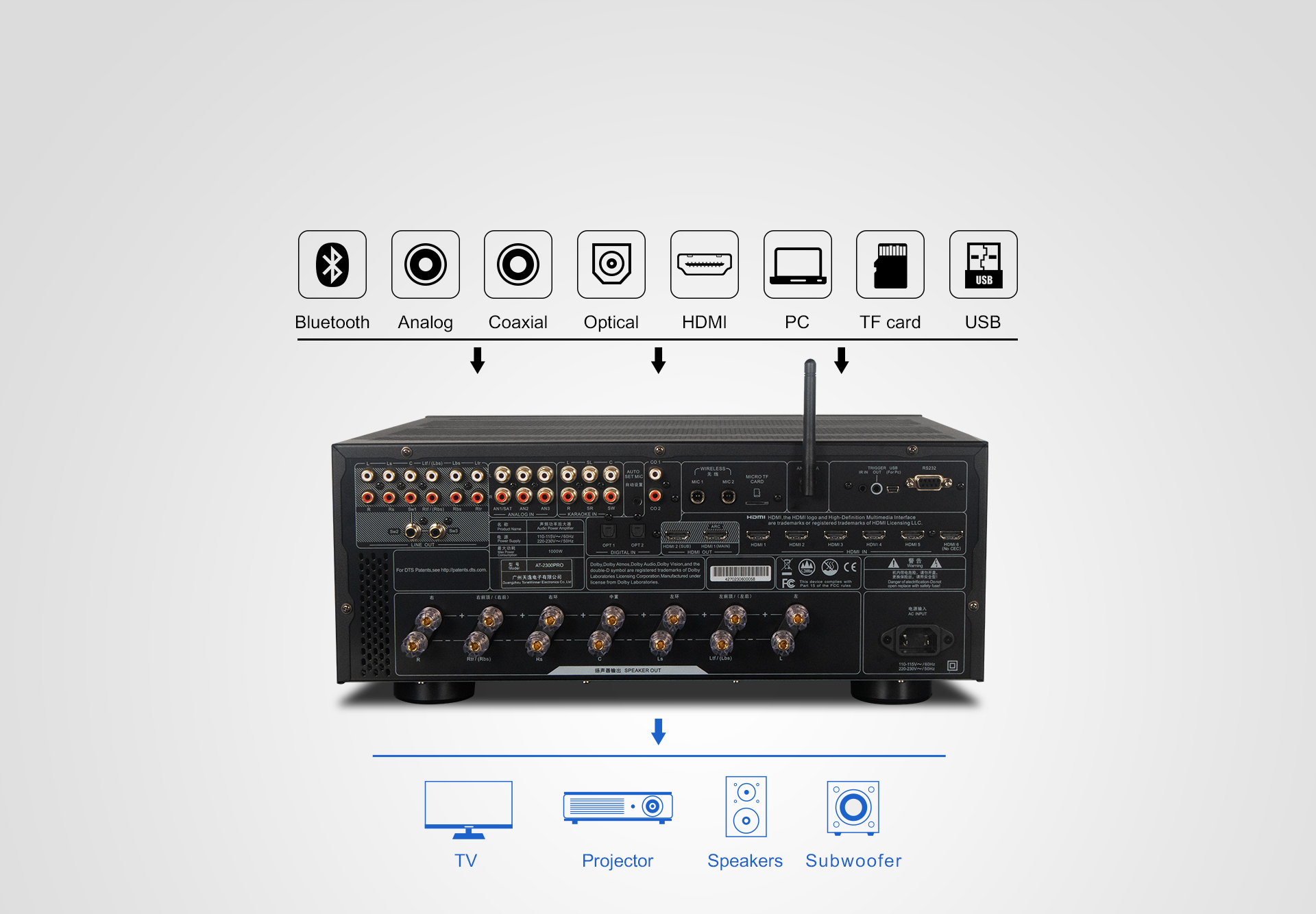 Supporta HDMl 6 in 2 out, ARc, ingressi ottici/coassiali, ingressi audio U disk/TF card/Pc, Bluetooth,
