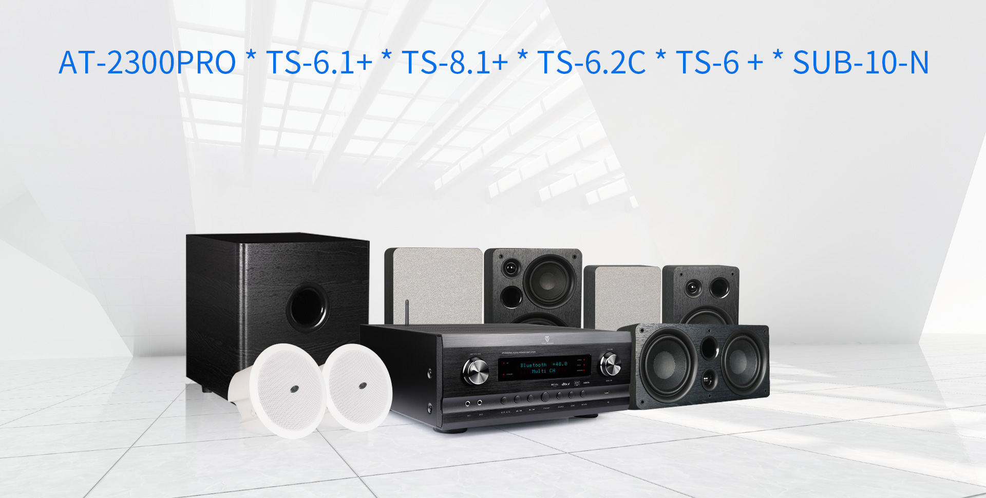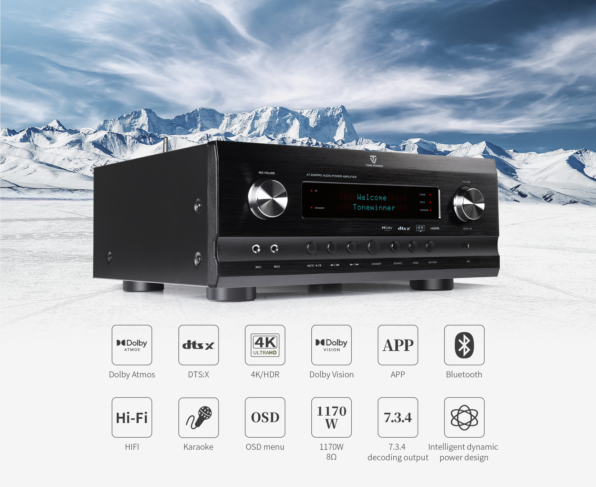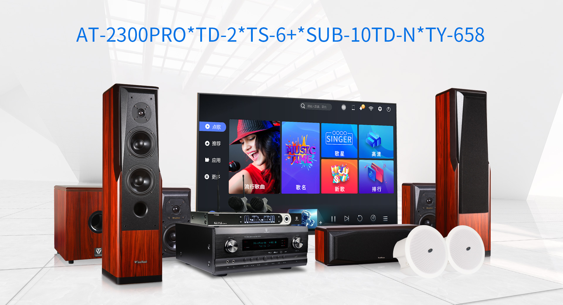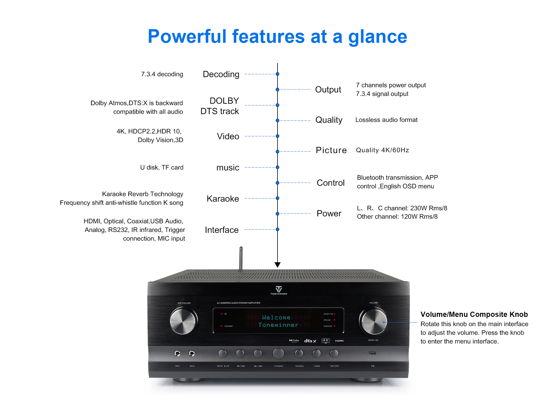 AT-2300PRO è un amplificatore integrato Dolby Atmos per home theater e karaoke. È un dispositivo all-in-one che combina un sistema home theater, un centro musicale personale e un sistema karaoke professionale. Il sistema karaoke immersivo professionale a 5.1.2 canali di AT-2300PRO è all'avanguardia nel settore audio. Supporta il canale di ritorno audio (ARC), che trasforma la smart TV in una macchina per ordinare le canzoni.