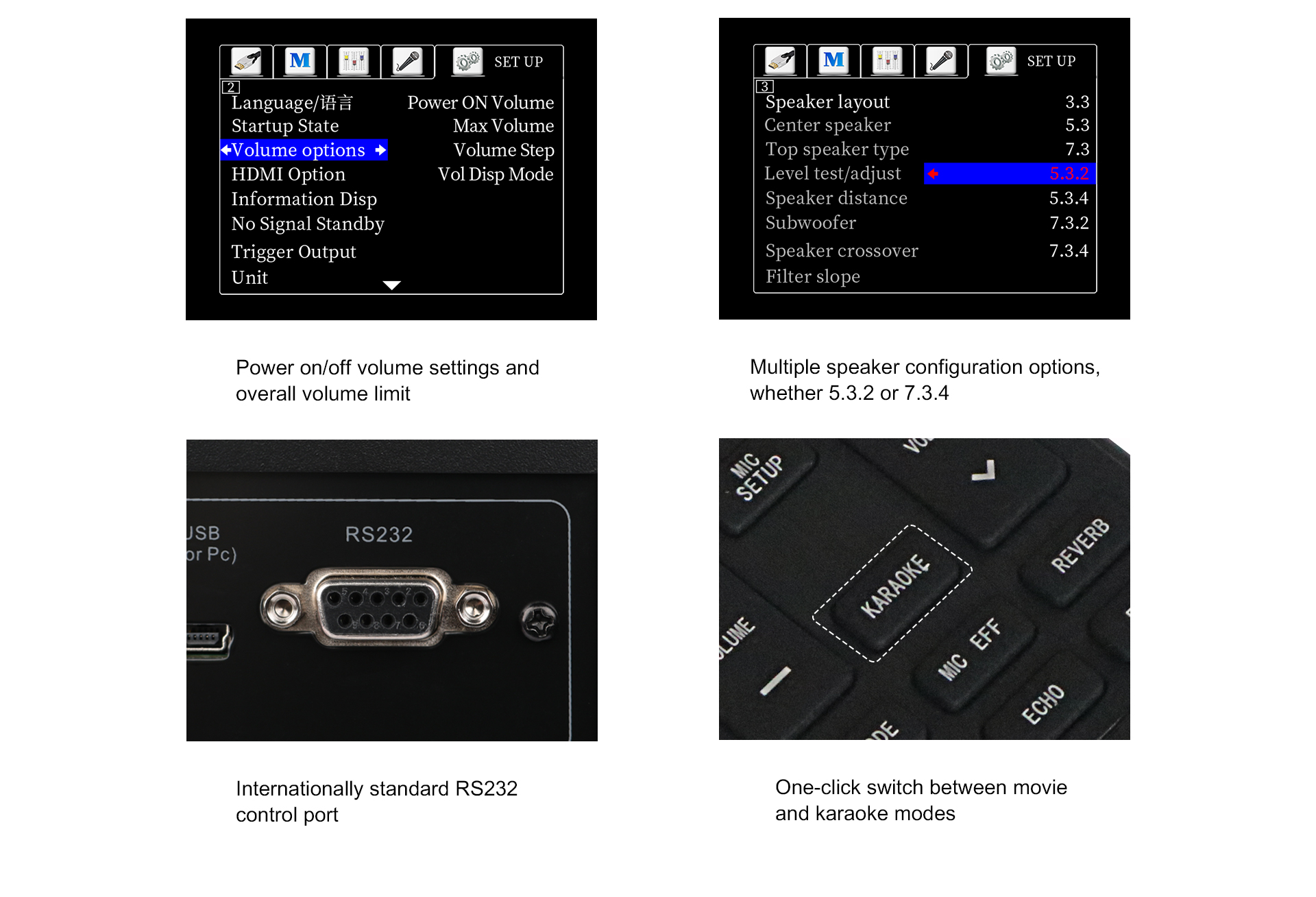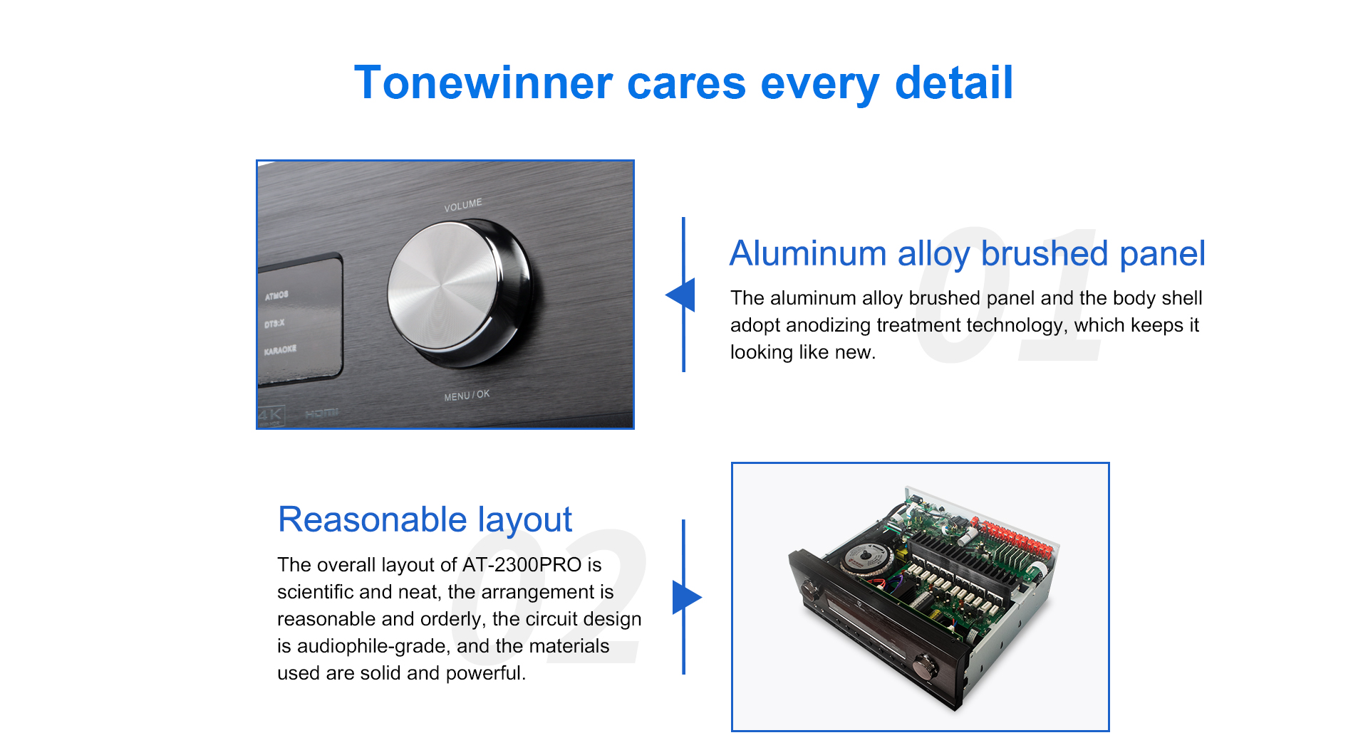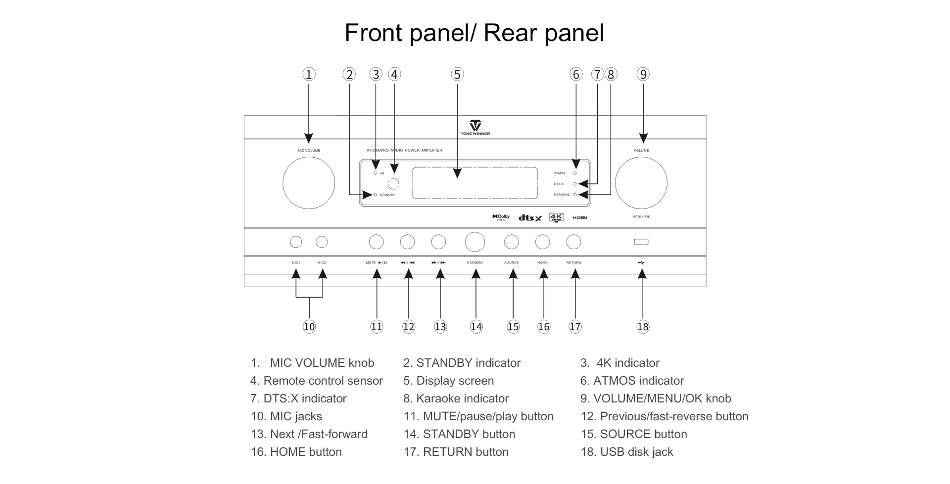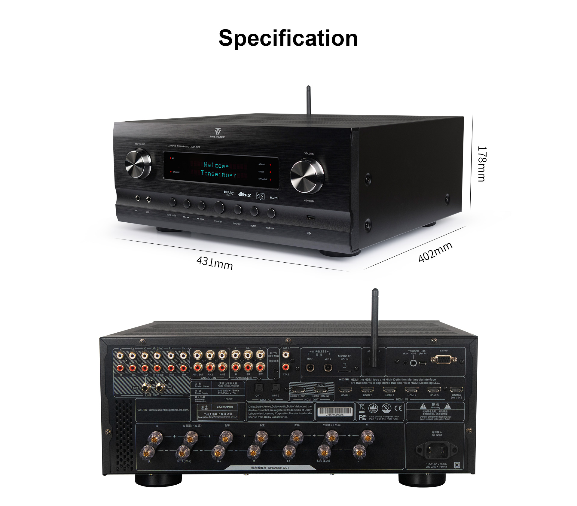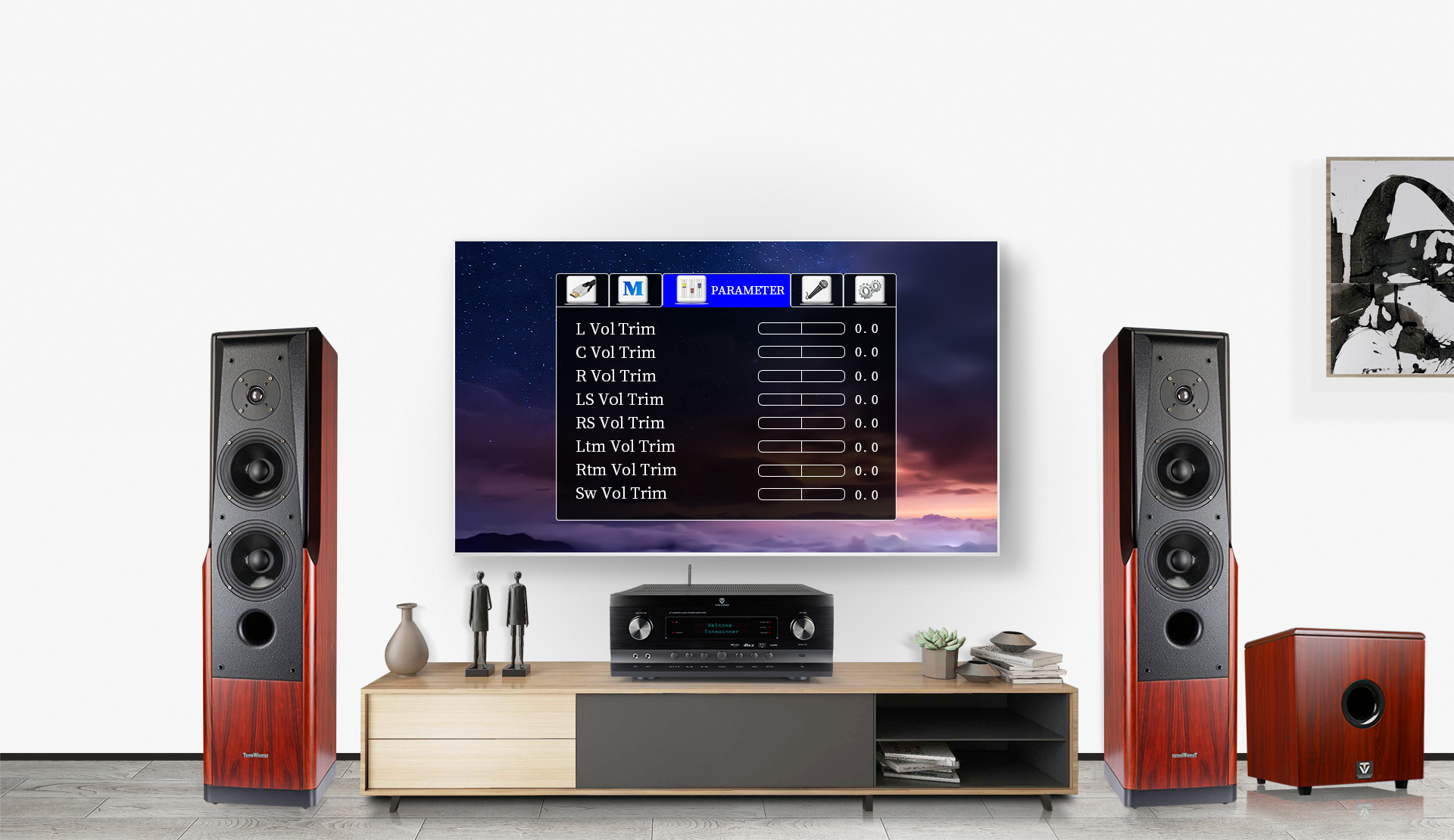 AT-2300PRO è un amplificatore integrato Dolby Atmos per home theater e karaoke. È un dispositivo all-in-one che combina un sistema home theater, un centro musicale personale e un sistema karaoke professionale. Il sistema karaoke immersivo professionale a 5.1.2 canali di AT-2300PRO è all'avanguardia nel settore audio. Supporta il canale di ritorno audio (ARC), che trasforma la smart TV in una macchina per ordinare le canzoni.