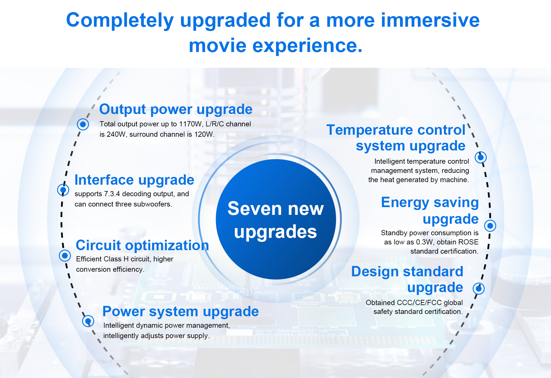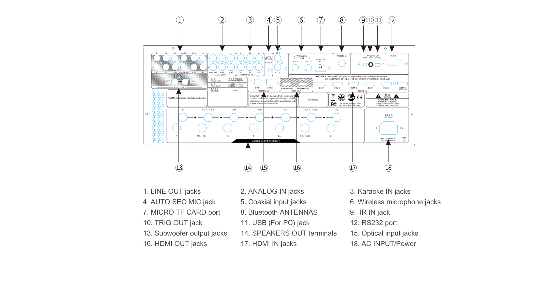 Uscita di linea di decodifica Dolby Atmos a 14 canali, può funzionare in modo indipendente come pre-decoder: