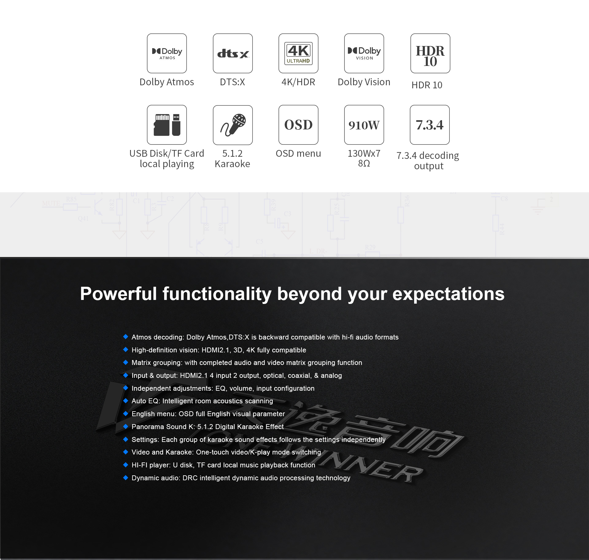 Insieme, completano la regolazione degli effetti sonori, la regolazione della curva di risposta in frequenza degli altoparlanti e la correzione del timbro per garantire la separazione del campo sonoro e la continuità del suono surround. Ricevitore