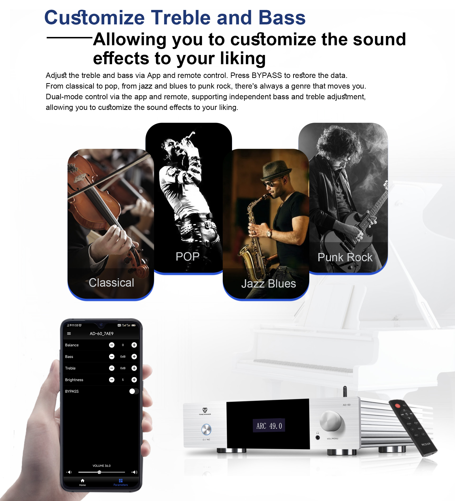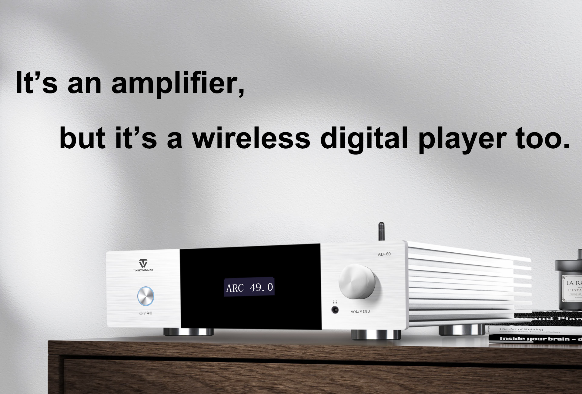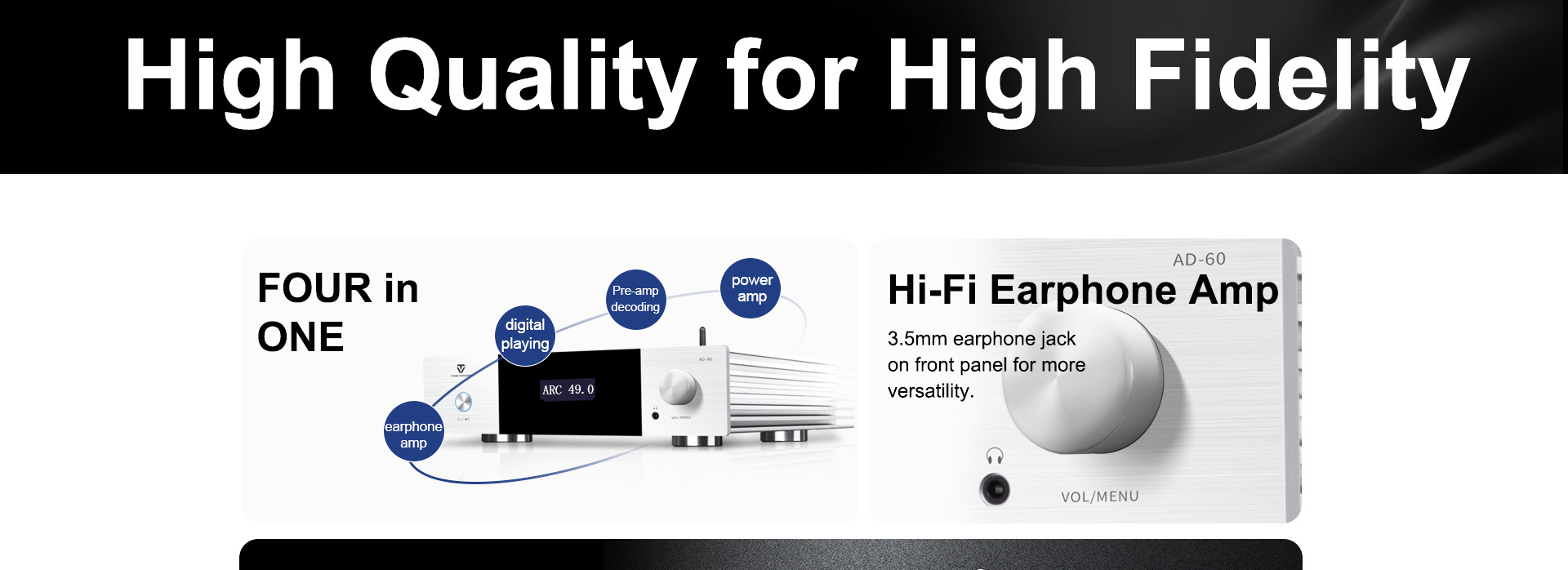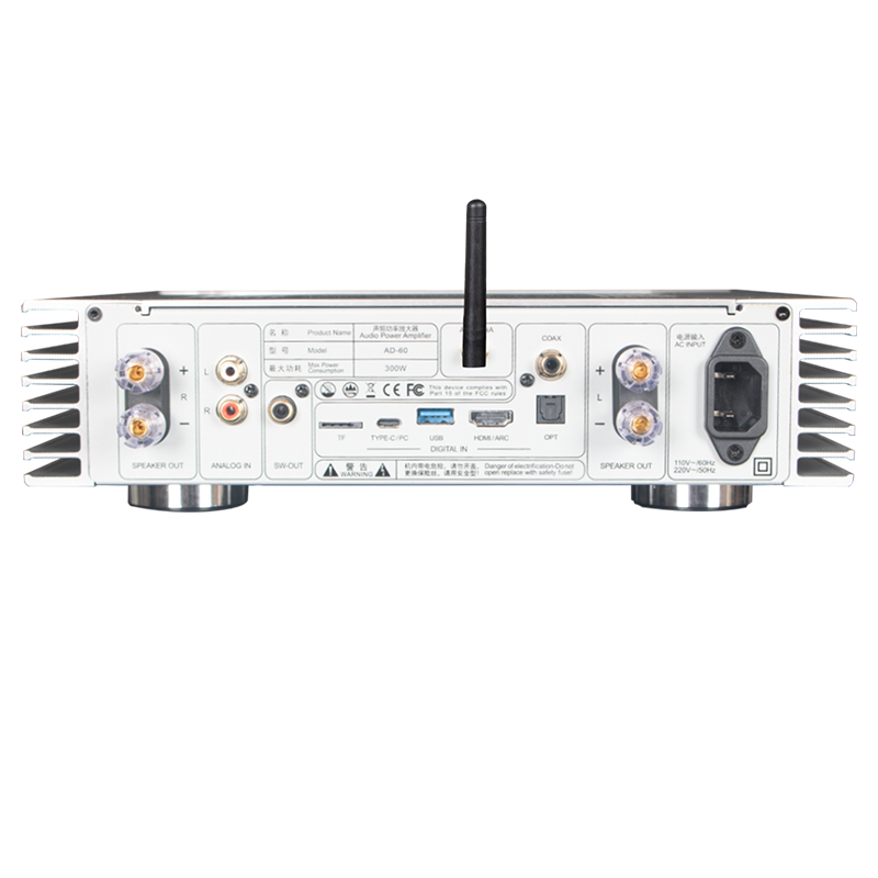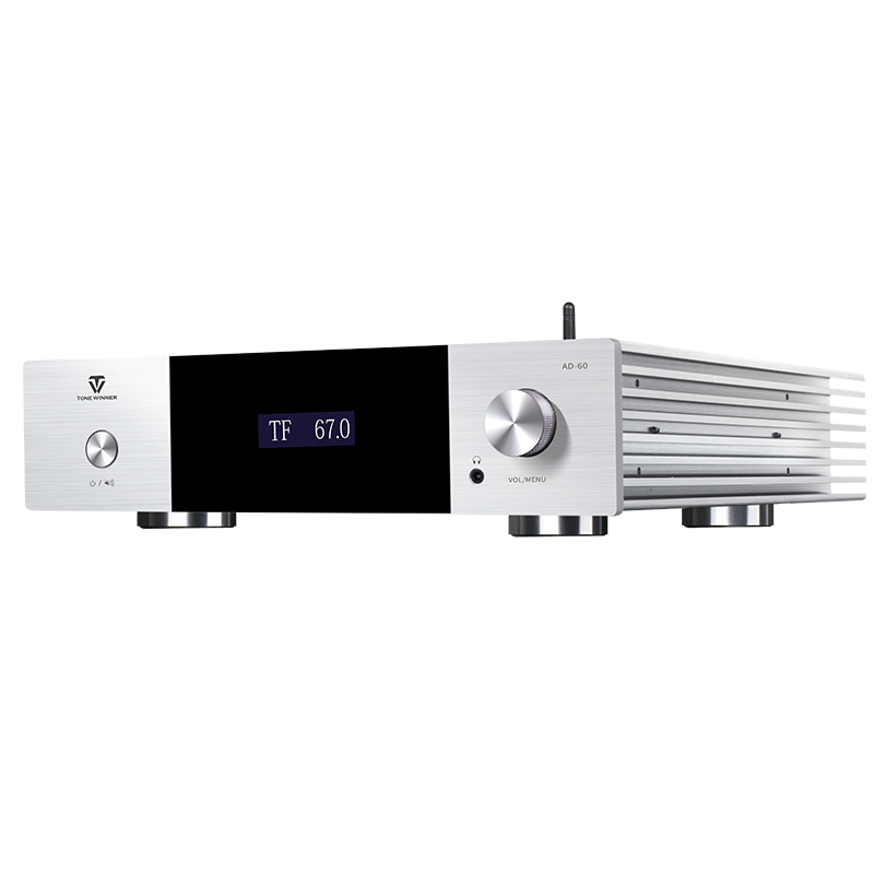 L'AD-60 è un amplificatore di potenza integrato in Classe AB che supporta sistemi 2.1. Integra decodifica preamplificata, amplificatore di potenza, riproduzione digitale e amplificatore per cuffie, con controllo tramite chiavetta USB, scheda TF, app per smartphone e ingressi digitali quali ottico, coassiale e USB-Audio per PC. È stato progettato e realizzato con materiali e componenti di alta qualità per offrire un suono analitico. Si tratta di un amplificatore di potenza elegante ed economico per un intrattenimento audio ad alta fedeltà.