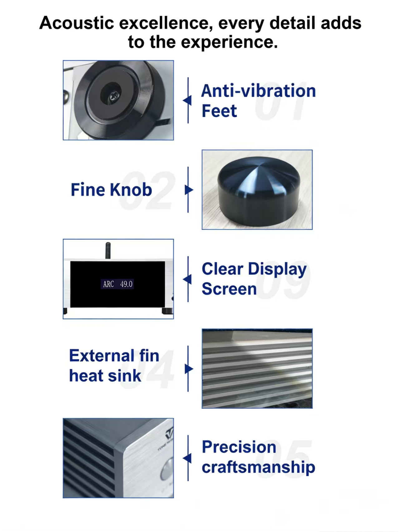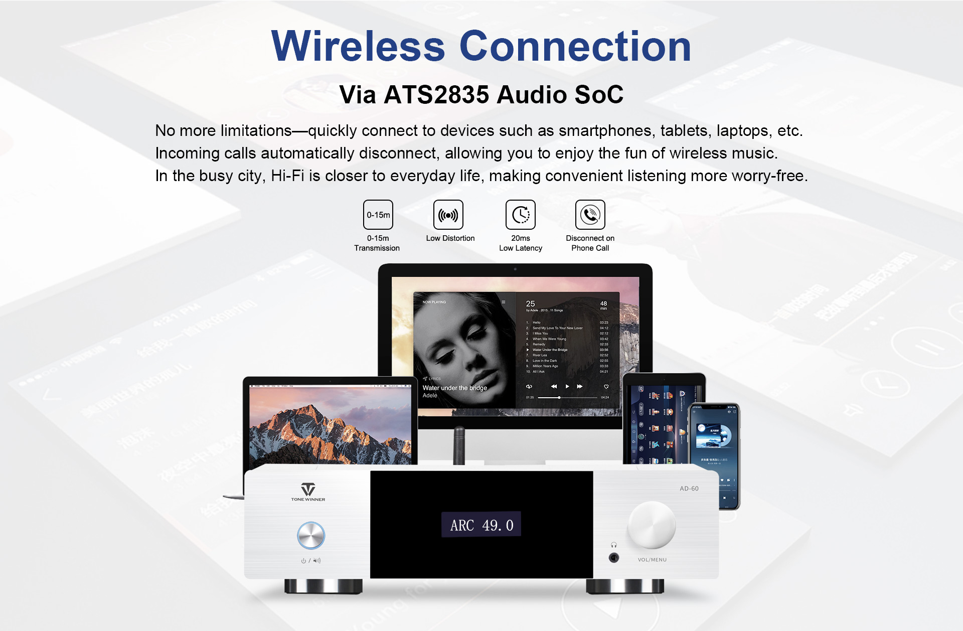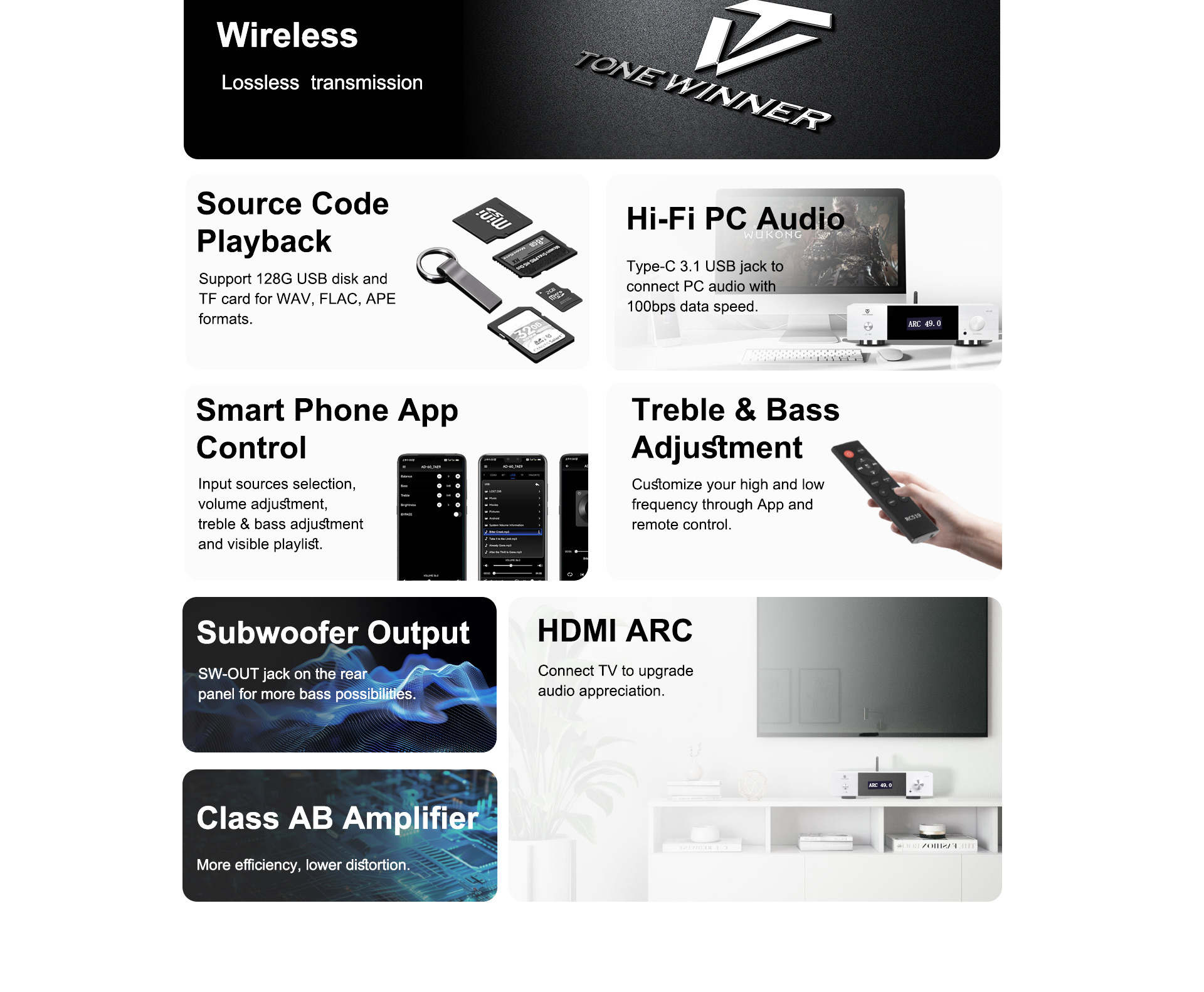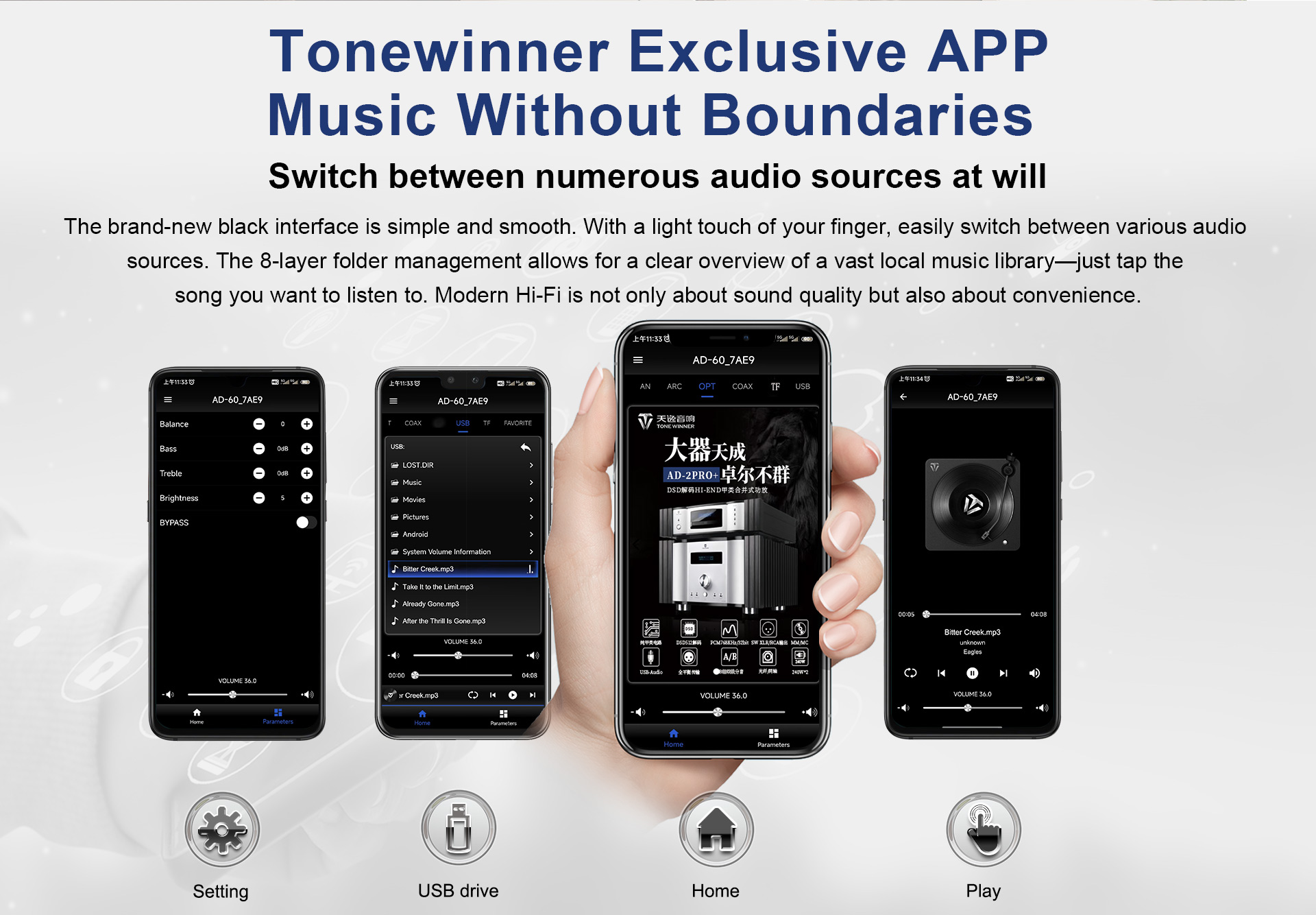 L'AD-60 è un amplificatore di potenza integrato in Classe AB che supporta sistemi 2.1. Integra decodifica preamplificata, amplificatore di potenza, riproduzione digitale e amplificatore per cuffie, con controllo tramite chiavetta USB, scheda TF, app per smartphone e ingressi digitali quali ottico, coassiale e USB-Audio per PC. È stato progettato e realizzato con materiali e componenti di alta qualità per offrire un suono analitico. Si tratta di un amplificatore di potenza elegante ed economico per un intrattenimento audio ad alta fedeltà.