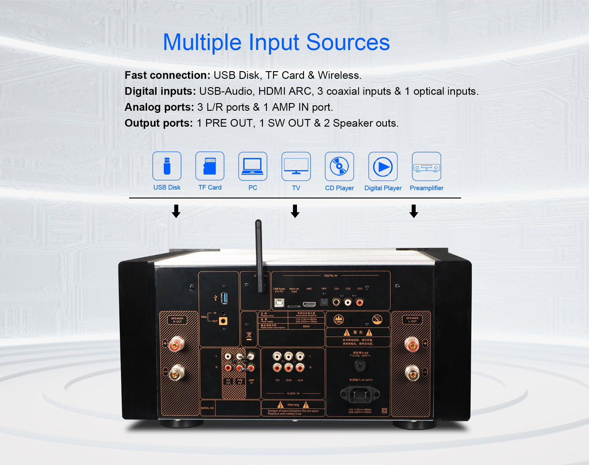 Le aree di alimentazione, ingresso, accumulo di energia e canale di amplificazione sinistro e destro sono separate in camere, in modo da ridurre l'interferenza delle onde elettromagnetiche libere.