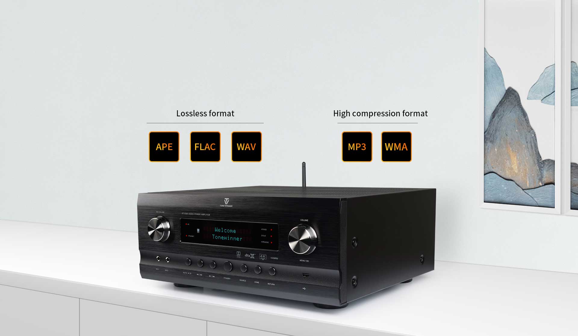 Supporta dischi USB da 128 GB, schede TF e formati APE, FLAC, WAV, MP3, WMA.